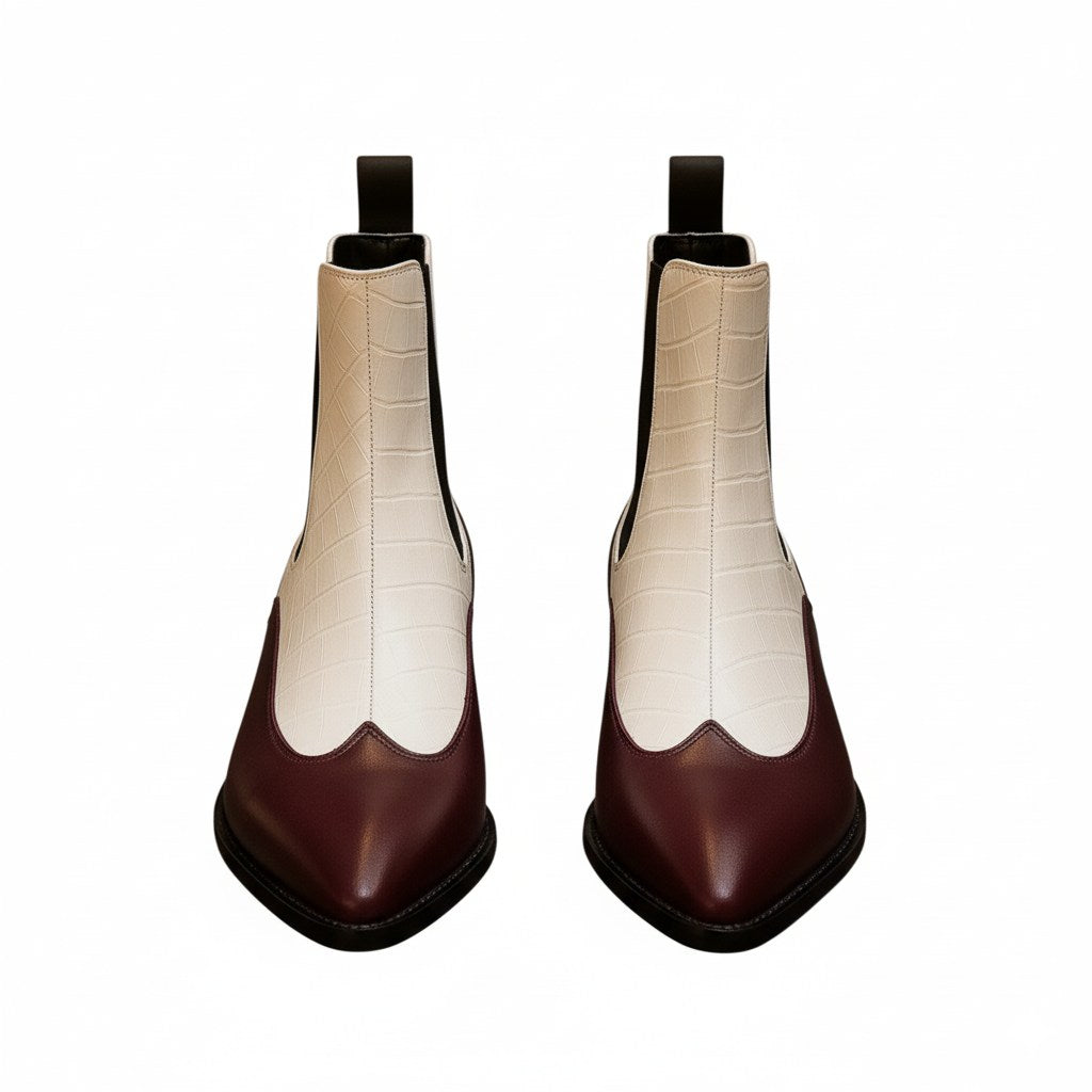 Elevate your stride with these dual-tone Chelsea boots crafted in premium croco-embossed leather. The bold interplay of black and white delivers a striking visual contrast with tactile depth. Elastic side panels and a sleek silhouette ensure effortless wear and timeless appeal. A metallic gold-accented block heel adds a touch of opulence to every step. Designed for curated wardrobes that celebrate texture, tone, and directional elegance. Perfect for statement dressing, from editorial spreads to high-street dominance.